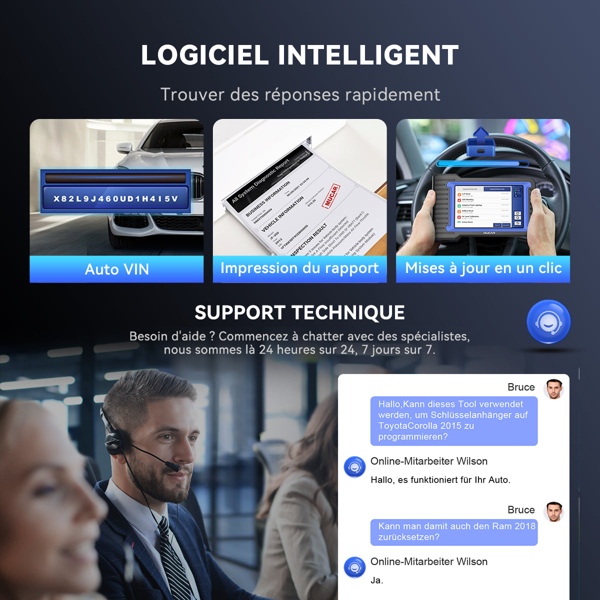 • Mises à jour en ligne gratuites pendant 3 ans (Remarque : Sans mise à jour, vous pouvez toujours utiliser toutes ces fonctions pour les logiciels déjà téléchargés, mais vous ne pourrez pas diagnostiquer les nouvelles marques de voitures et fonctions mises à jour).