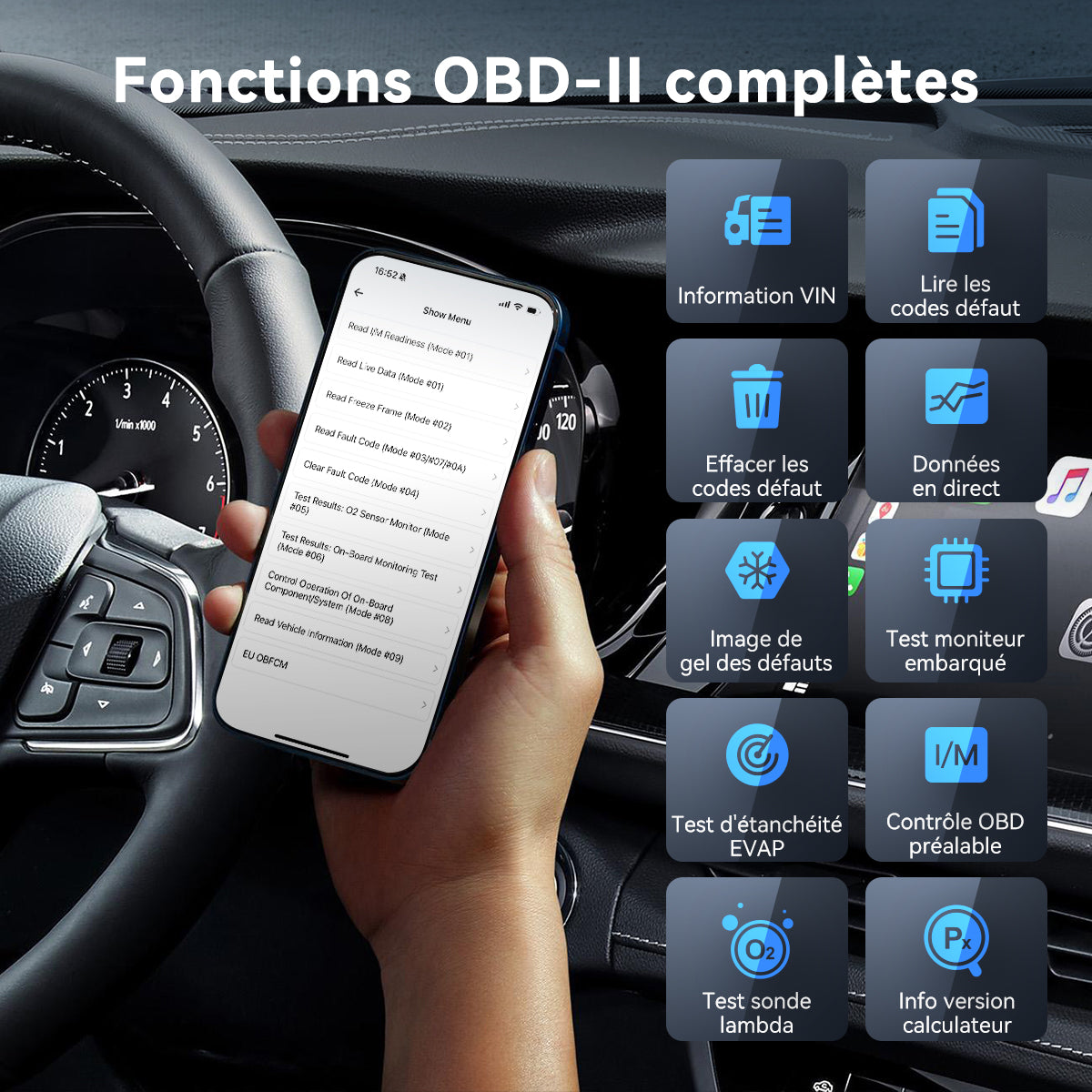 Solution tout-en-un pour le diagnostic OBD2: lecture/effacement de codes défauts, données gelées (freeze frame), flux de données en direct, contrôle antipollution (I/M Ready), tests actuateurs • calibrations.